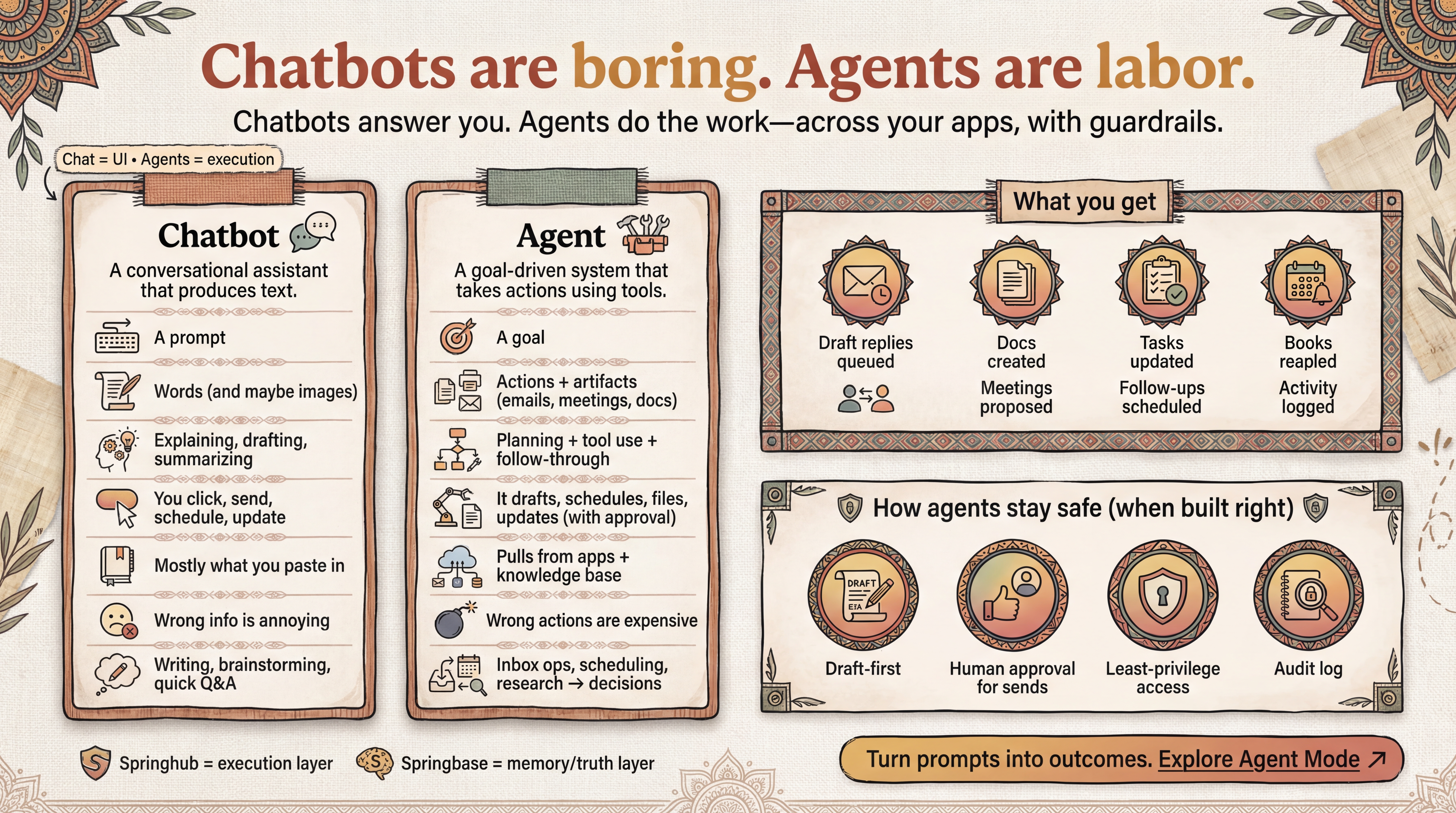 That’s where Springbase helps: it acts like a structured, reusable knowledge layer so your agent isn’t reinventing the wheel every time: